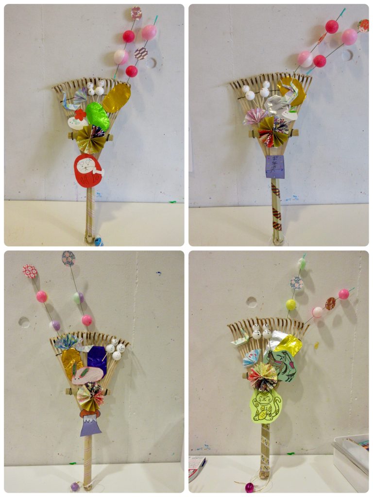 来年の干支の墨絵とおめでたい熊手を作りました。